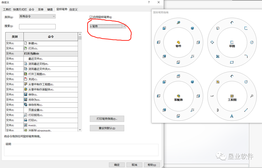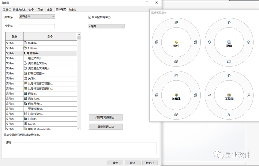 SW可以在零件,工程图,装配体还有草图的环境下设立相应功能的鼠标笔势,该功能可以提高设计效率,节约设计所需要时间。