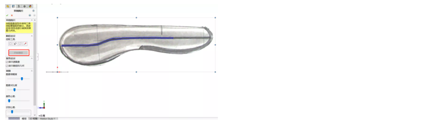 我们这里使用的是在草图中,将草稿图片作为参考底板,新建草图绘制,在草图绘制中使用样条曲线和直线命令描边绘制的曲线。曲线绘制完成后,我们可以将底稿草图隐,方便下一步操作。